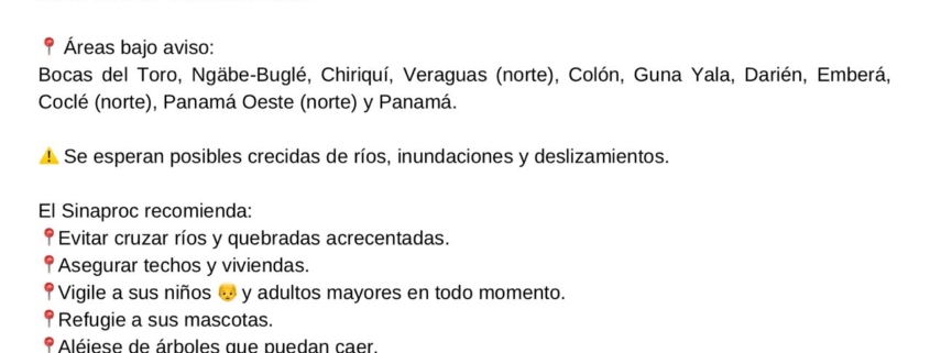 Panamá, 22 de febrero de 2026. El Sistema Nacional de Protección Civil comunica que según el Instituto de Meteorología e Hidrología de Panamá (IMHPA) se pronostican lluvias y tormentas significativas desde el 23 hasta el 25 de febrero de 2026.