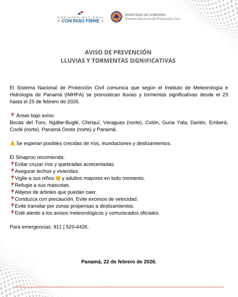 Panamá, 22 de febrero de 2026. El Sistema Nacional de Protección Civil comunica que según el Instituto de Meteorología e Hidrología de Panamá (IMHPA) se pronostican lluvias y tormentas significativas desde el 23 hasta el 25 de febrero de 2026.