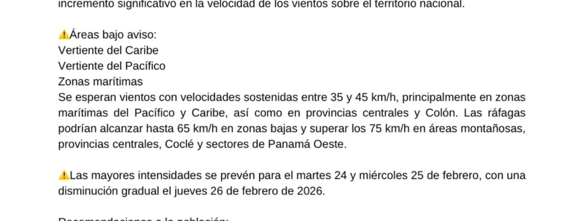 Panamá, 23 de febrero de 2026. El Sistema Nacional de Protección Civil (SINAPROC), en atención al aviso emitido por el Instituto de Meteorología e Hidrología de Panamá (IMHPA), informa a la ciudadanía sobre la vigilancia por condiciones ventosas vigente hasta las 2:00 p.m. del 26 de febrero de 2026.