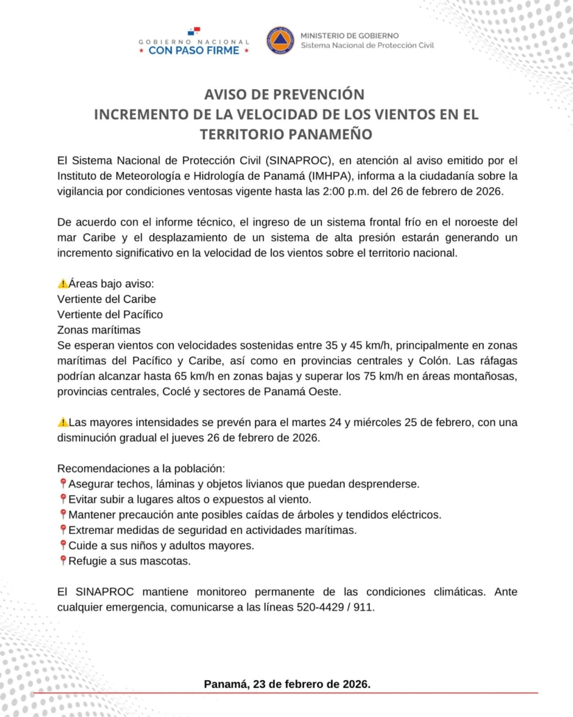 Panamá, 23 de febrero de 2026. El Sistema Nacional de Protección Civil (SINAPROC), en atención al aviso emitido por el Instituto de Meteorología e Hidrología de Panamá (IMHPA), informa a la ciudadanía sobre la vigilancia por condiciones ventosas vigente hasta las 2:00 p.m. del 26 de febrero de 2026.