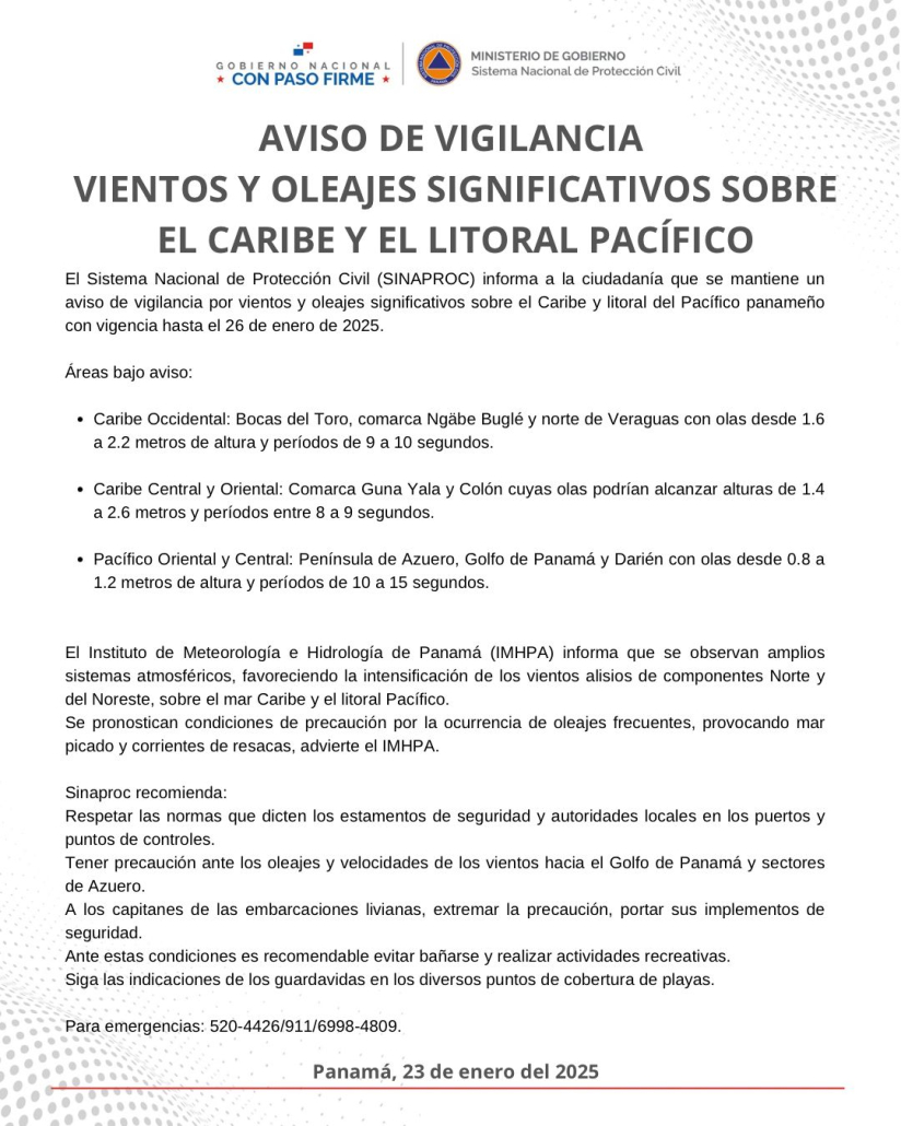 Panamá, 23 de enero de 2025.- El Sistema Nacional de Protección Civil (SINAPROC) informa a la ciudadanía que se mantiene un aviso de vigilancia por vientos y oleajes significativos sobre el Caribe y litoral del Pacífico panameño con vigencia hasta el 26 de enero de 2025.