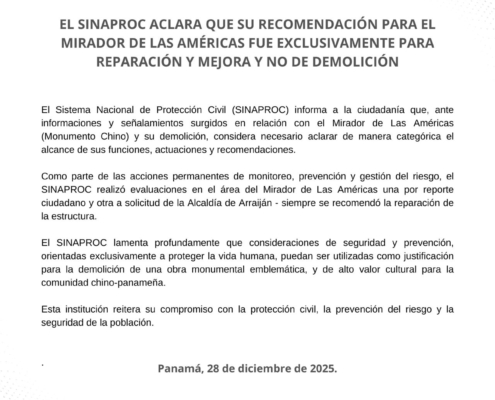 Panamá, 28 de diciembre de 2025.- El Sistema Nacional de Protección Civil (SINAPROC) informa a la ciudadanía que, ante informaciones y señalamientos surgidos en relación con el Mirador de Las Américas (Monumento Chino) y su demolición,…