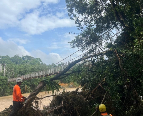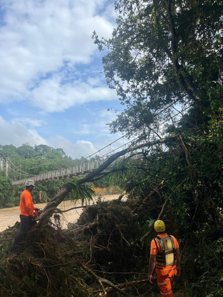 recorridos de verificación para identificar otras posibles afectaciones. De igual forma, equipos se desplazaron para inspeccionar otro puente colgante en el sector del río Caloveborita, tras reportes de moradores. Hasta el momento, se mantienen lluvias leves e intermitentes en la zona.