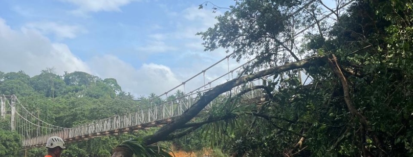 Durante la verificación en Río Luis Centro, moradores de la comunidad, junto al representante local, reportaron la afectación de un puente colgante que conecta la provincia de Veraguas con la zona comarcal. La estructura fue impactada por un árbol arrastrado por la creciente, situación que fue atendida por el personal en sitio, logrando despejar el paso.