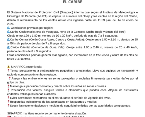 Panamá, 12 de enero de 2026.- El Sistema Nacional de Protección Civil (Sinaproc) informa que según el Instituto de Meteorología e Hidrología de Panamá (IMHPA) se espera un aumento del oleaje y los vientos en la región del Caribe, debido…