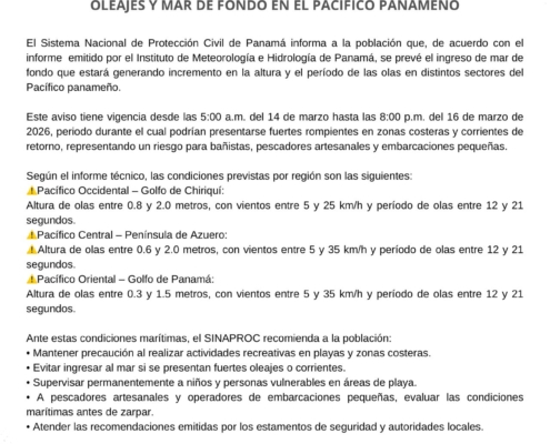 Panamá, 14 de marzo de 2026.- El Sistema Nacional de Protección Civil de Panamá informa a la población que, de acuerdo con el informe emitido por el Instituto de Meteorología e Hidrología de Panamá, se prevé el ingreso de mar de fondo…