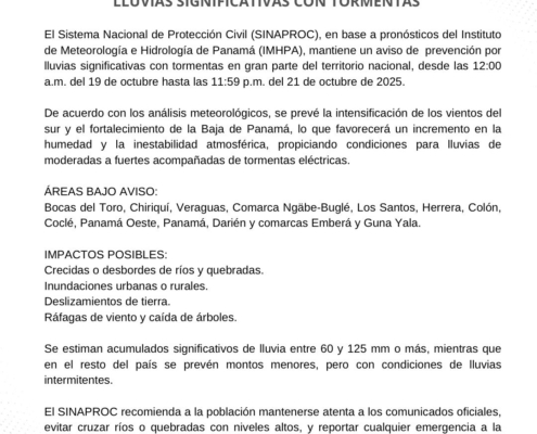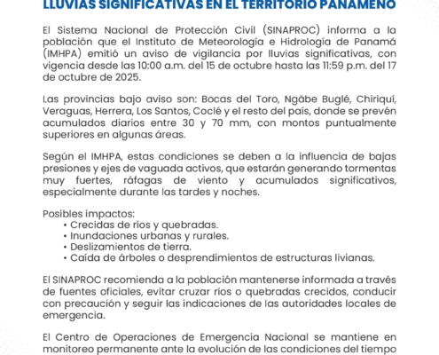 Aviso de prevención Lluvias significativas en el territorio panameño