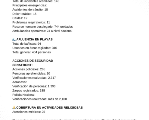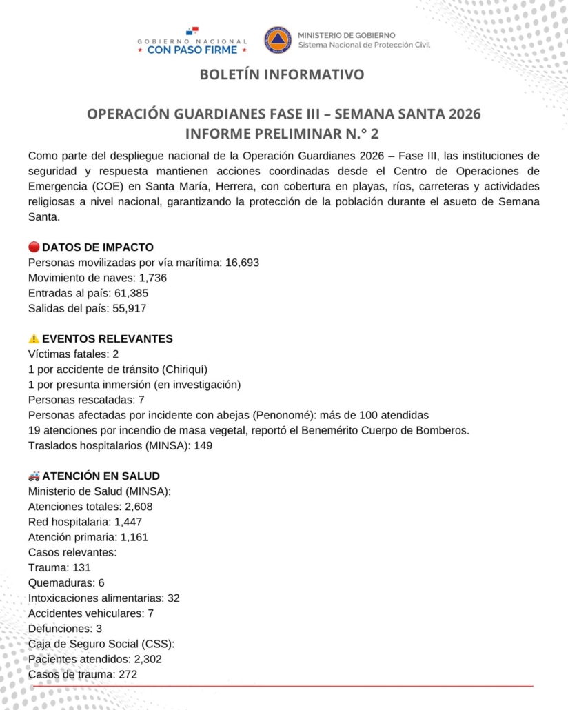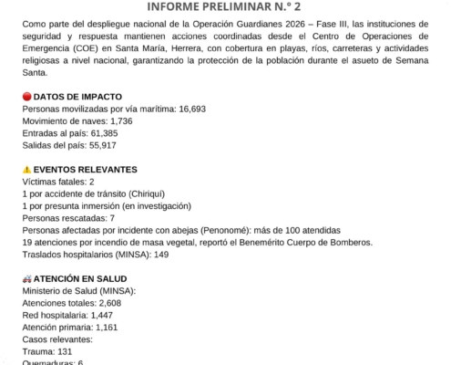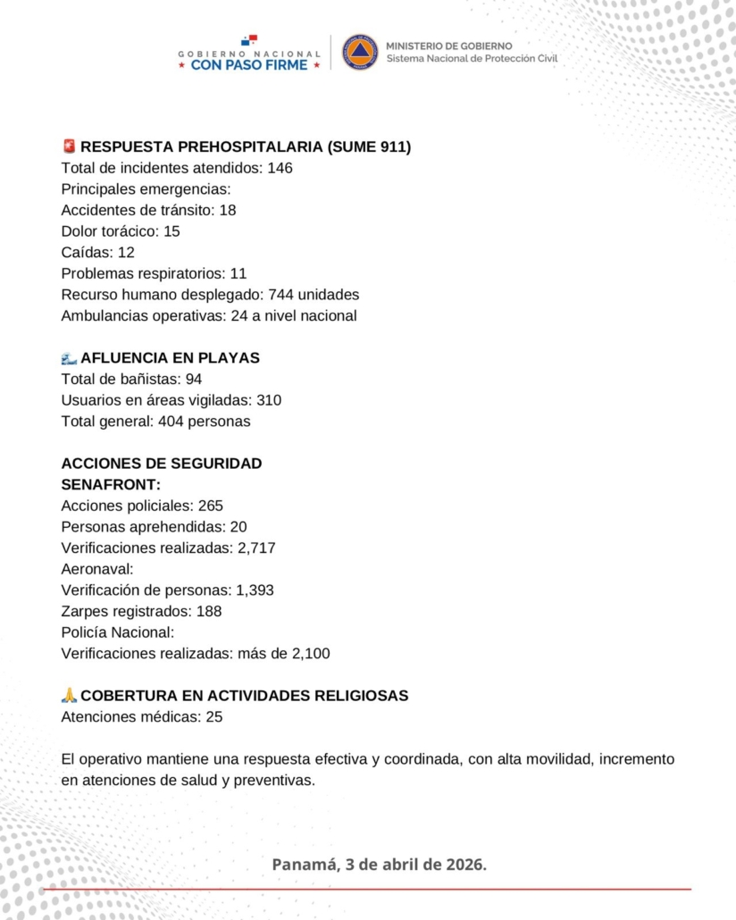 Viernes, 03 de abril de 2026.-  Como parte del despliegue nacional de la Operación Guardianes 2026 – Fase III, las instituciones de seguridad y respuesta mantienen acciones coordinadas desde el Centro de Operaciones de Emergencia (COE) en Santa María, Herrera, con cobertura en playas, ríos, carreteras y actividades religiosas a nivel nacional, garantizando la protección de la población durante el asueto de Semana Santa.